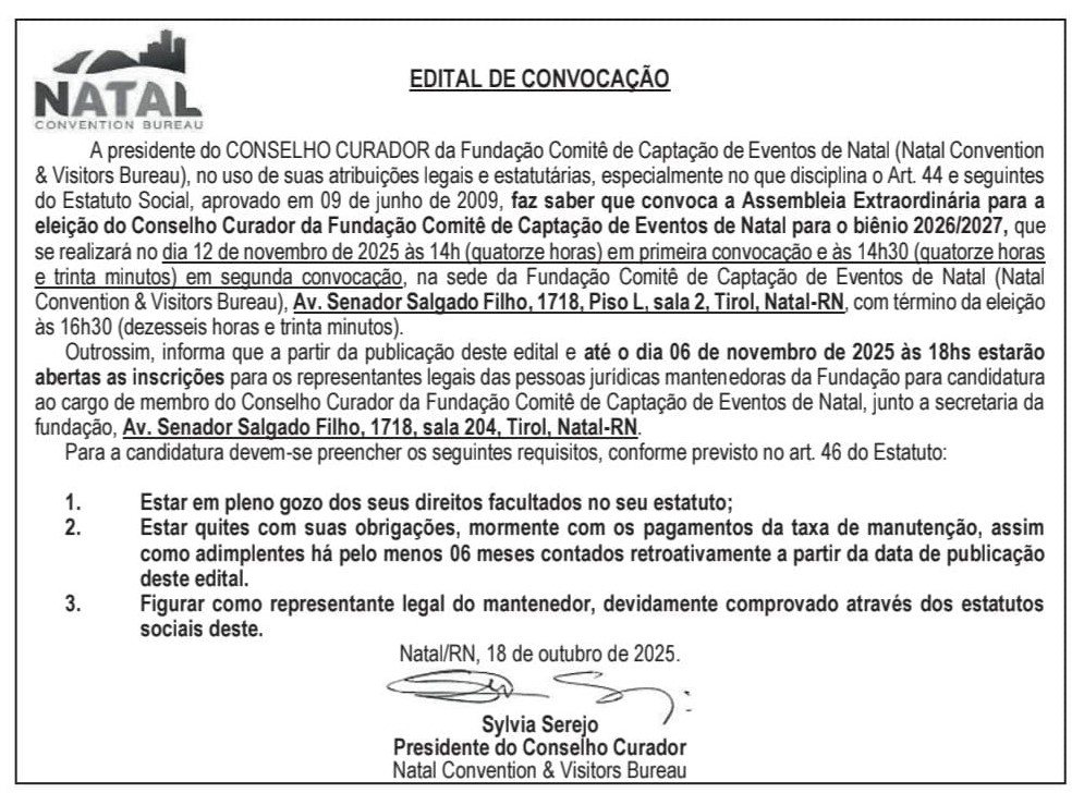 Assembleia Extraordinária para a eleição do Conselho Curador da Fundação Comitê de Captação de Eventos de Natal para o biênio 2026/2027, que se realizará no dia 12 de novembro de 2025.